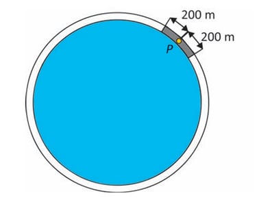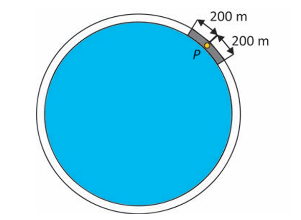 Questão 143. No entorno de uma lagoa circular, cujo raio mede 1 km, há um uma ciclovia. Devido aos frequentes roubos de bicicleta, a prefeitura planeja alocar policiais em posições estratégicas para patrulhar essa ciclovia, de forma a torná-la totalmente protegida. Um ponto da ciclovia é considerado protegido se houver pelo menos um policial a, no máximo, 200 m de distância daquele ponto, posicionado sobre a ciclovia. A figura ilustra um ponto P sobre a ciclovia, que estará protegido se houver pelo menos um policial posicionado sobre a região de cor cinza escuro. Desconsidere a largura da pista da ciclovia e utilize 3 como aproximação para p.