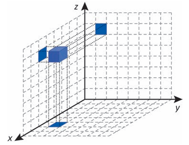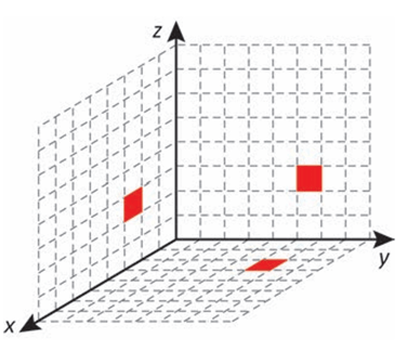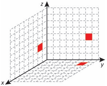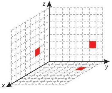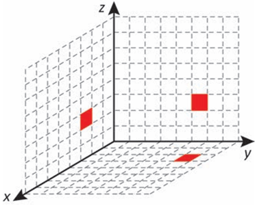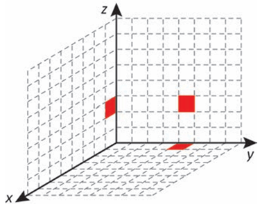 Cada deslocamento efetuado por esse cubo se dá sempre em uma das direções definidas pelos três eixos coordenados. Ao se movimentar a partir da posição inicial, esse cubo se aproximou 3 unidades do plano yz, se afastou 5 unidades do plano xz e se aproximou 4 unidades do plano xy. A figura que apresenta as projeções ortogonais desse cubo sobre os três planos coordenados, após efetuar as movimentações descritas, é